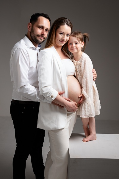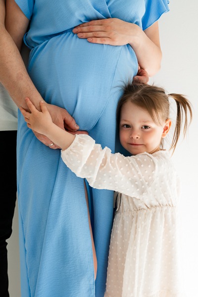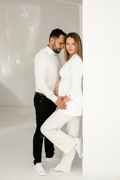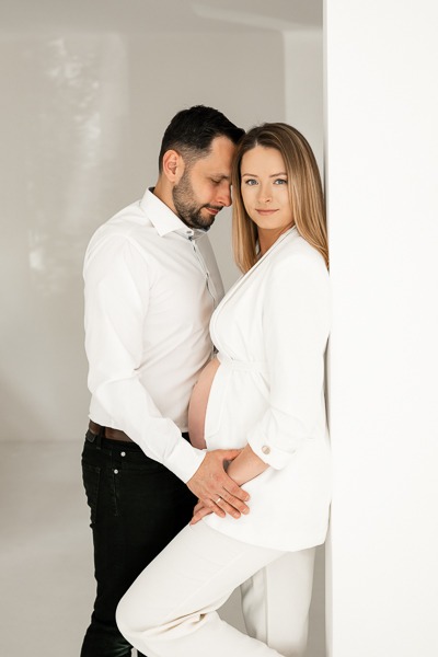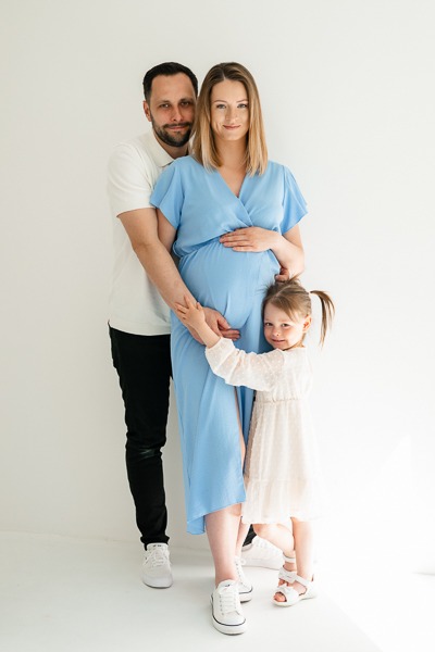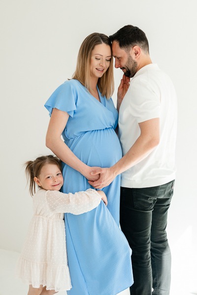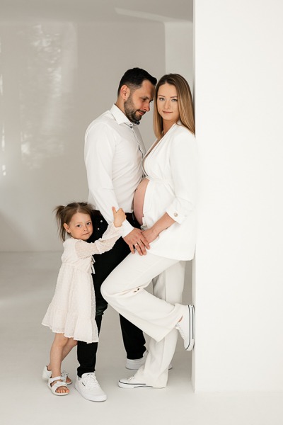 Anita postawiła na klasykę i elegancję. Minimalistyczne stylizacje w bieli i czerni idealnie podkreśliły jej urodę oraz ciążowe kształty. Jednak to obecność Pawła i małej Oliwki dodała tej sesji najwięcej ciepła. Oliwka, w roli starszej siostry, była niezwykle zaangażowana – jej uściski i buziaki dawane brzuszkowi to kadry, które po prostu trzeba zobaczyć. Takie sesje rodzinne w studio to doskonały sposób na stworzenie pamiątki, która za kilkanaście lat będzie dla Aleksandra bezcennym dowodem na to, jak bardzo był wyczekiwany.